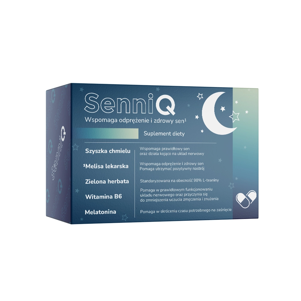 Zastosowanie: SenniQ to suplement diety stworzony z myślą o wspieraniu relaksu i zdrowego snu. Zawiera unikalne połączenie ekstraktu z szyszek chmielu, melisy lekarskiej, zielonej herbaty, witaminy B6 i melatoniny. Melisa lekarska wspiera pozytywny nastrój i zdrowy sen, szyszki chmielu wywołują działanie odprężające i wspomagają spokojny sen. Melatonina, wzięta na krótko przed snem, skraca czas zasypiania, natomiast witamina B6 wspiera układ nerwowy i zmniejsza uczucie zmęczenia.