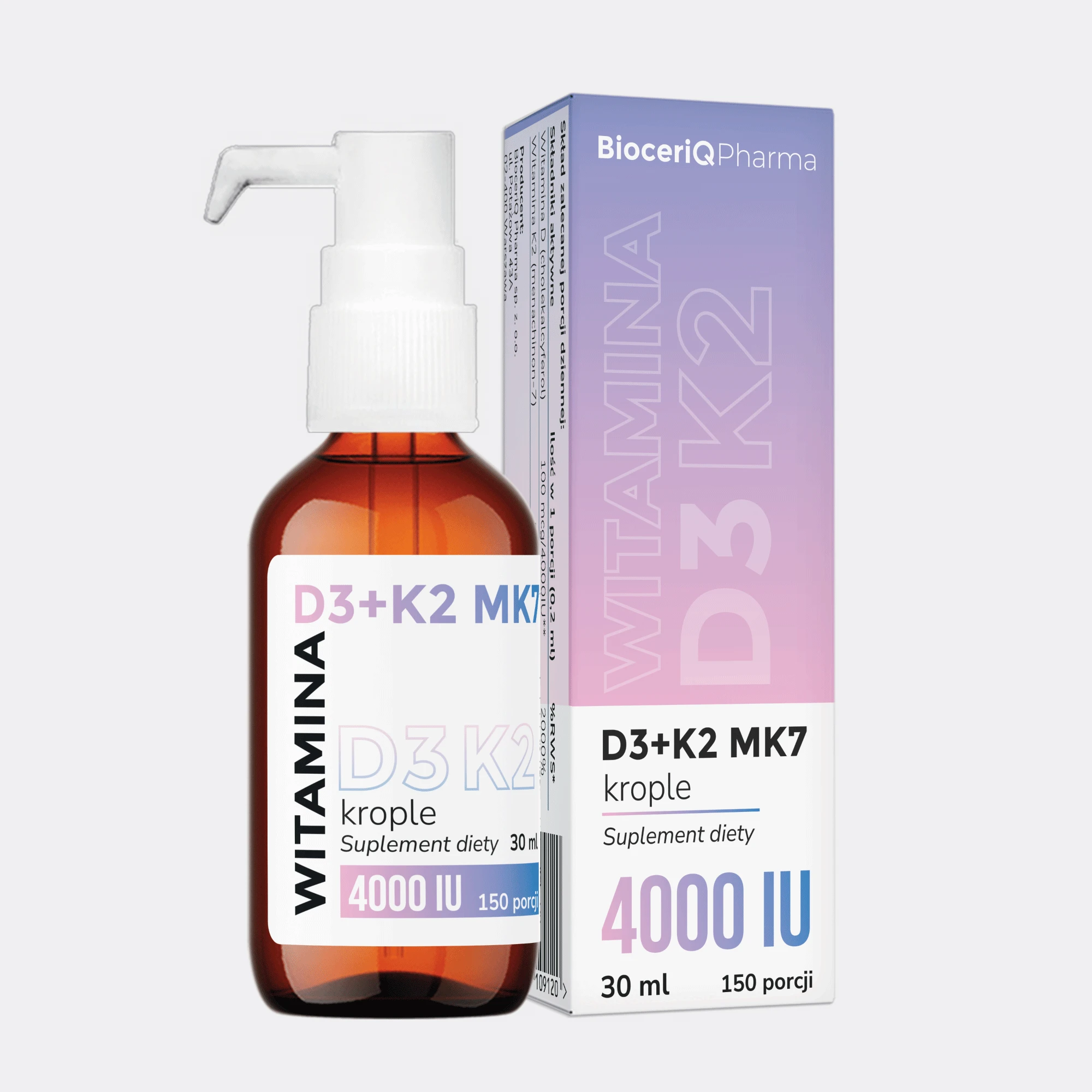 BioceriQ D3 + K2 MK7 to suplement diety w postaci kropli, który zawiera w składzie witaminy rozpuszczalne w tłuszczach: